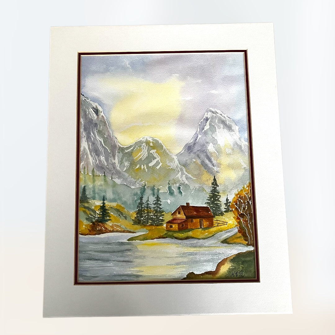 Cette ancienne aquarelle signée Marie-Thérèse.D, conserve tout son charme. Elle illustre avec douceur la majesté de nos montagnes françaises et la chaleur des chalets en bois. Des touches de violet viennent apaiser le regard et accentuer la sérénité de la scène.