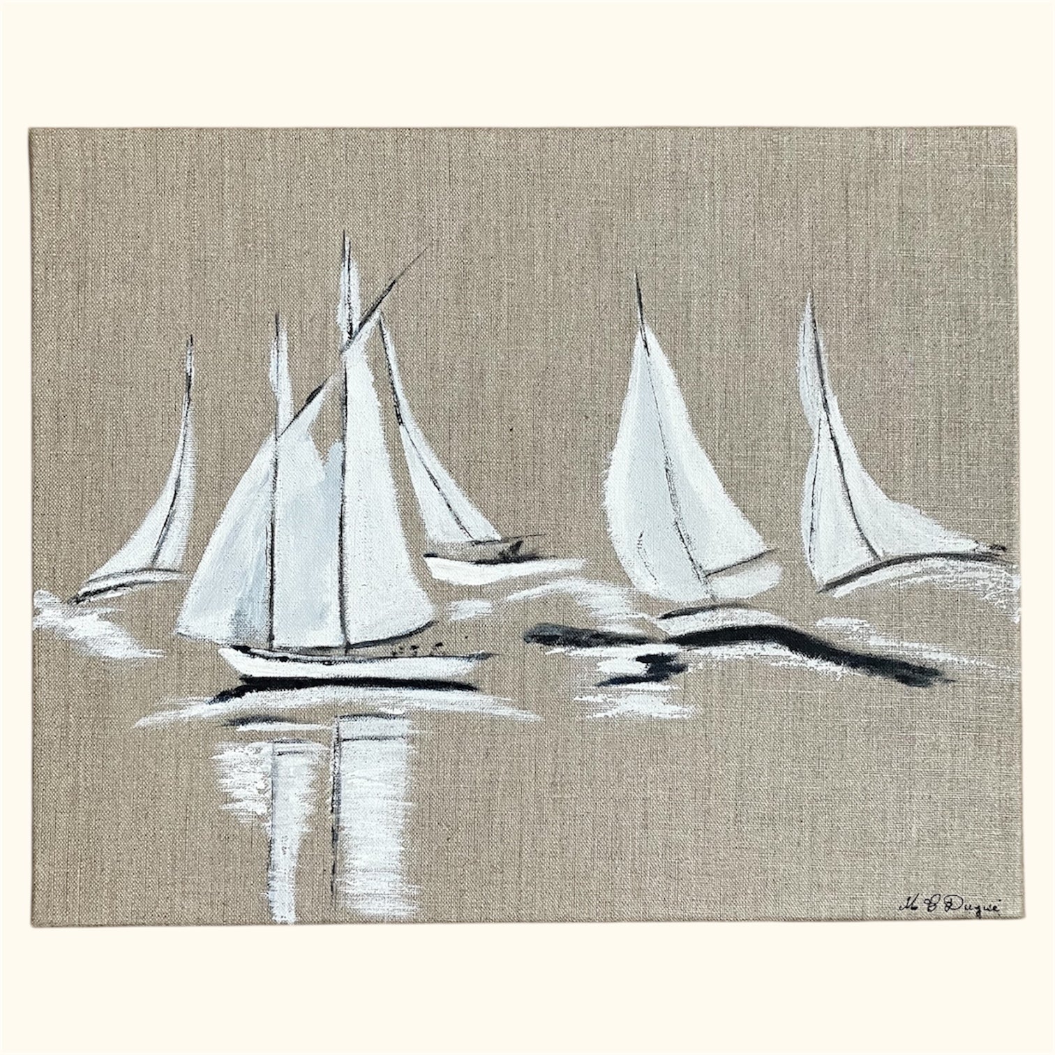 Réalisée à l’acrylique par Marie-Thérèse.D, cette toile sobre et épurée représente des bateaux flottant paisiblement. Sa simplicité et sa discrétion en font une œuvre apaisante, parfaite pour créer une ambiance calme et élégante.